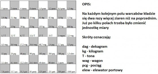 Jest taka orientalna legenda o człowieku, który w jakiejś ważnej sprawie doradził władcy, za co ten był mu tak wdzięczny, że powiedział: żądaj nagrody, każdą ci dam. Człowiek skromnie, acz przebiegle powiedział: oto plansza warcabów, 64 pola. Każ swoim zarządcom zboża położyć na pierwszym polu jedno ziarno zboża, na drugim polu dwa ziarna, na trzecim polu cztery, na czwartym – osiem, i tak dalej, a na każdym kolejnym polu warcabów każ położyć dwa razy więcej ziaren, niż na poprzednim.