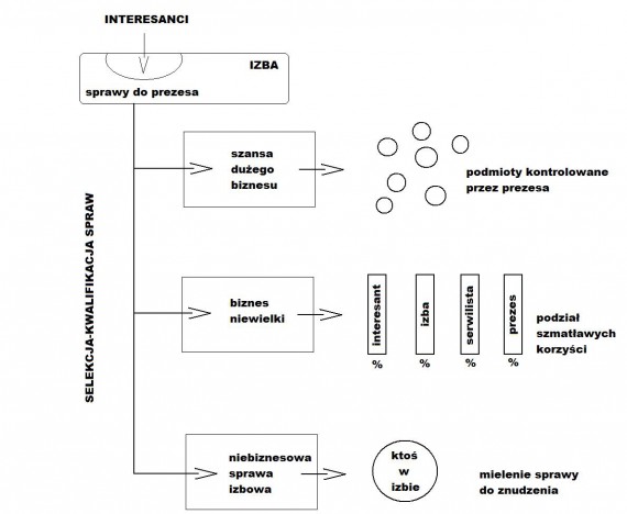 1. Jeśli widać, że człowiek podejmuje się fajnego, potencjalnie dochodowego biznesu, z którego przy wykorzystaniu możliwości izby (w tym osobistych „przełożeń” prezesa na urzędy) da się ugryźć jakiś niekulawy owoc – sprawa jest kierowana do „podwykonawcy”, czyli jakiegoś podmiotu kontrolowanego przez prezesa. Tam jest traktowana poważnie i prawie na pewno przynosi korzyść, za co interesant jest wdzięczny lub nie, zależnie od tego, kto z tej korzyści najwięcej ma;