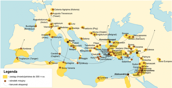 Pierwsi chrześcijanie – wyznawcy boskości Jezusa organizujący się wokół tej idei – rozpoczęli swoją apostolską misję od dobrowolnej, choć sytuacyjnie wymuszonej diaspory, pielgrzymując z tym przesłaniem przede wszystkim wewnątrz Imperium, ale też wyprawiający się poza jego obszar wpływu, co obrazuje mapka: