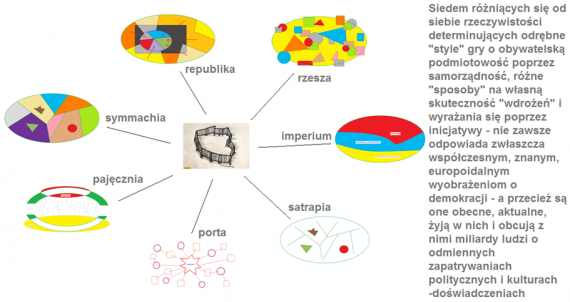 8. Polska – nie jedyna – zdradza objawy krańcowego „uniżonego oswojenia” demokracją zachodnią, inną niż doświadczenie środkowo-europejskie, udającą że stawia na helleńskie porozumienie niezawisłych samorządów-polis (czyli na Symmachię), a w rzeczywistości odwołuje się w swoich rozwiązaniach do teutońskiego doświadczenia Rzeszy (Reich: hybrydowe relacje podmiotowych księstw, biskupstw, cechów, miast, zakonów, kondotierów), z elementami rzymsko-imperialnego „państwa prawnego”;