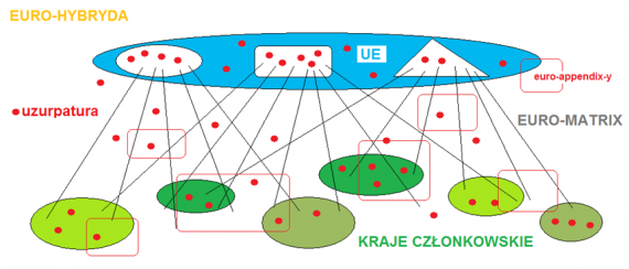 Zaledwie czerpie jednak, a nie stosuje wprost. Można powiedzieć, że hybrydowość europejska (UE) jest kontynuacją pan-germańskich poszukiwań meta-systemu, w którym wszyscy mieliby poczucie współ-uczestnictwa i współ-stanowienia, ale w rzeczywistości „władcą” autorytarnym mogłaby zostać uzurpatorska „diaspora” ludzi rozumiejących się wpół gestu, z których każdy ma jawną, demokratyczną legitymizację, o którą walczy „na własną rękę” w swoim rodzimym kraju albo w innych przestrzeniach, np. w „euro-appendix-ach”, poza formalnymi strukturami UE.